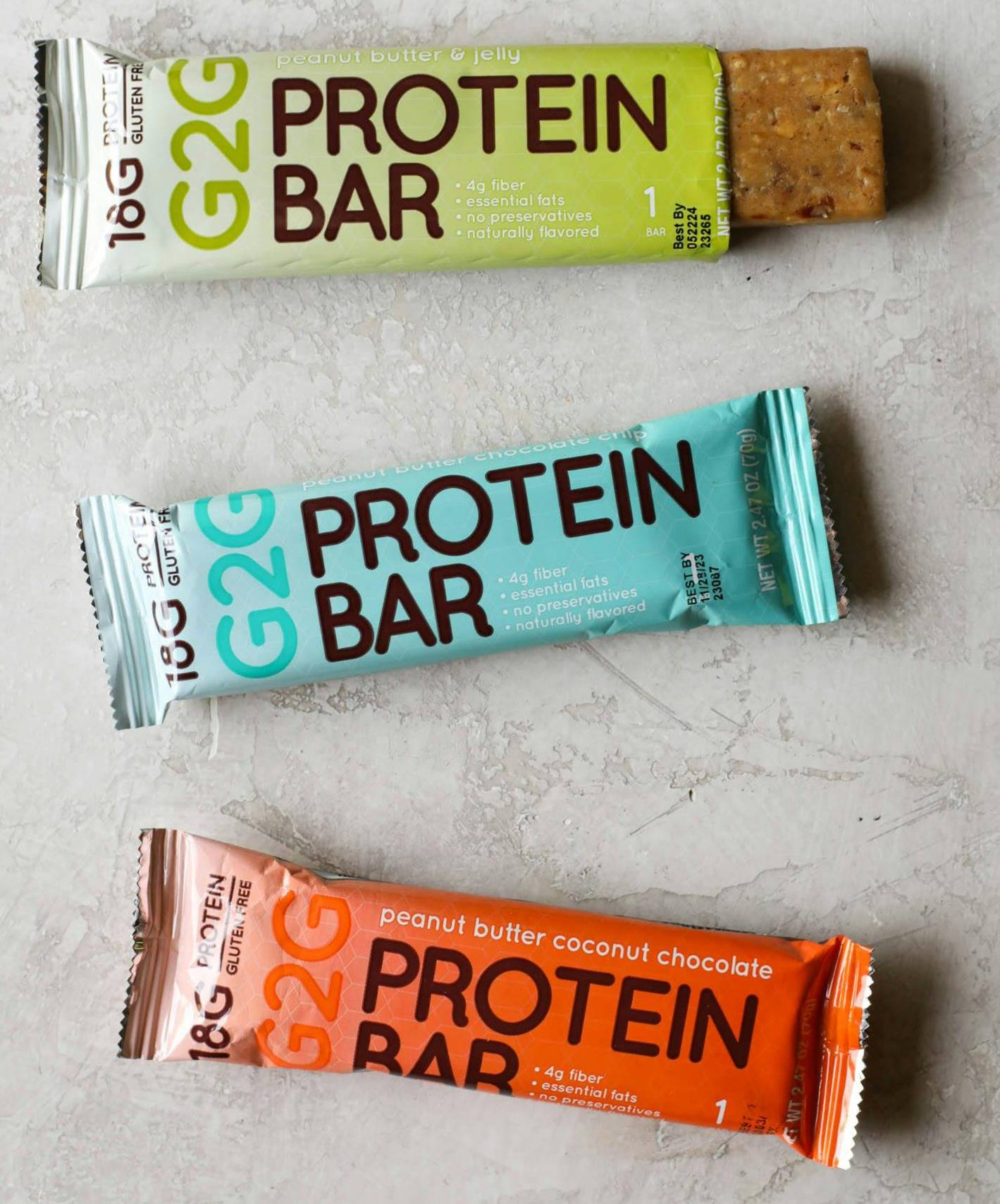 The Protein Bar We Love For Grab And GoG2G Protein Bars have been a favorite of ours for many years. Due to their higher calorie count and significant amount of protein (18 grams per bar), we use them as a hearty snack or small meal replacement from time to time. Here’s What We Love About Them: These gluten-free bars are substantial and offer a significant amount of protein, enough to be a big snack, pre- or post-workout fuel, or even a small meal replacement. There are 8 flavors and we like them all, though peanut butter chocolate chip, mocha, and peanut butter jelly are team favorites. The variety pack is a great way to find your fave!